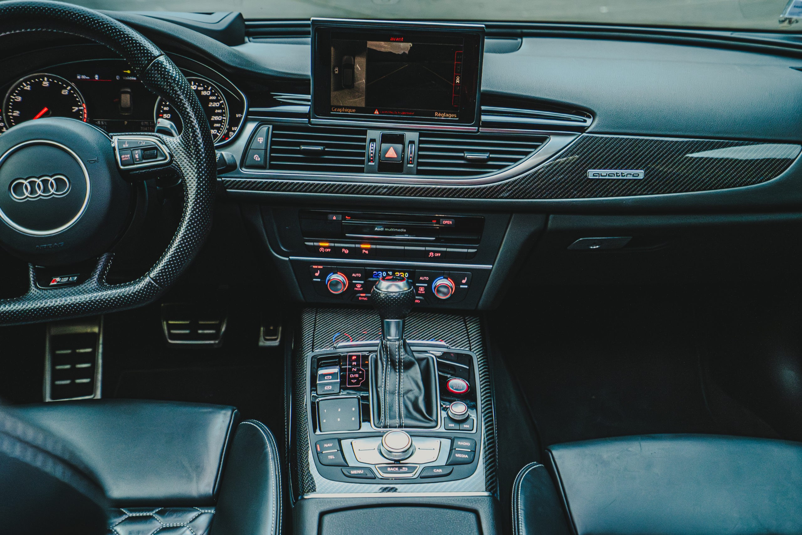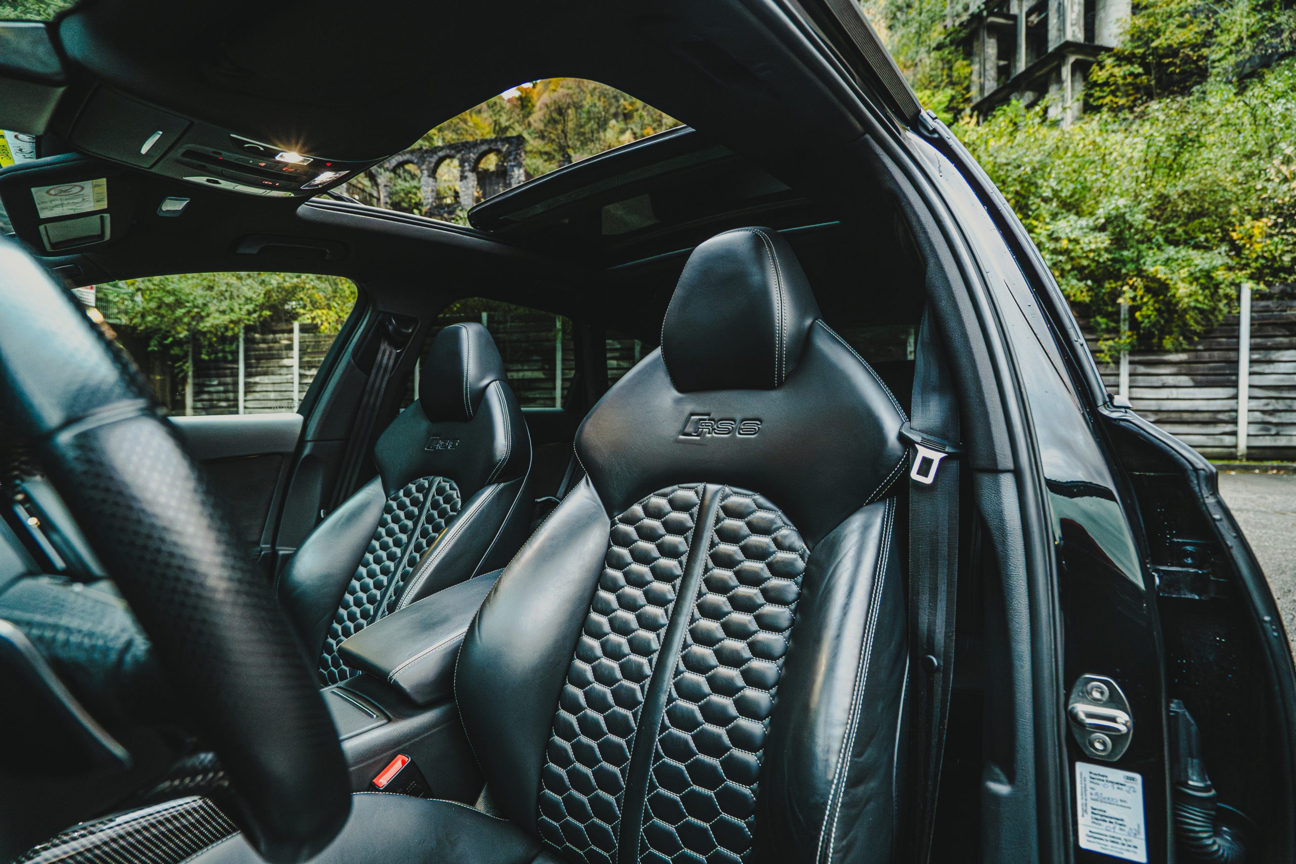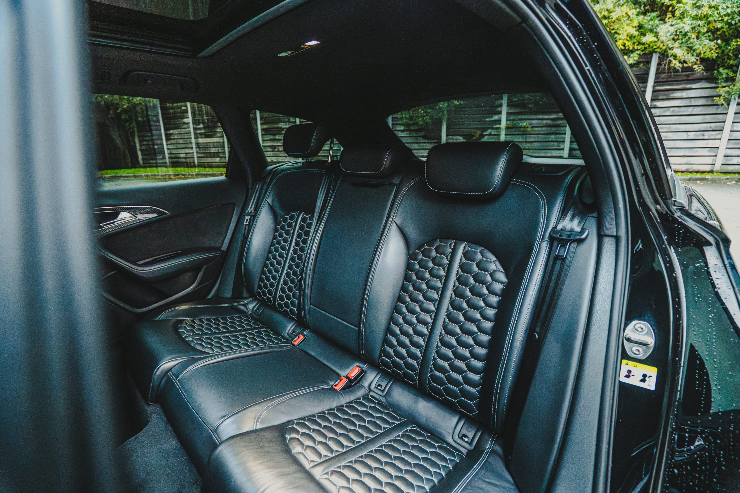– Sellerie cuir valcona avec surpiqûres contrastées en nid d’abeille et embossée rs6